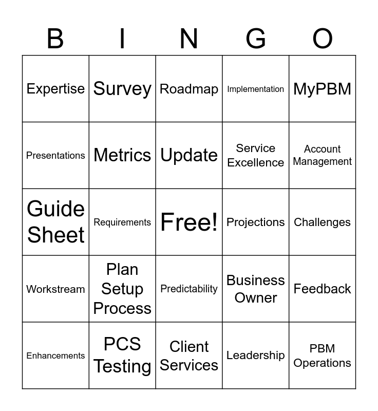 This bingo card has a free space and 33 words: Roster, logistics, Requirements, Journey, Workstream, Metrics, MyPBM, Enhancements, Survey, Results, Update, Roadmap, Recognitions, Operations, Projections, Account Management, PCS Testing, Guide Sheet, Plan Setup Process, Business Owner, Predictability, Common way, Expertise, Challenges, Client Services, PBM Operations, Implementation, Service Excellence, Presentations, Feedback, Vision, Leadership and Communication.