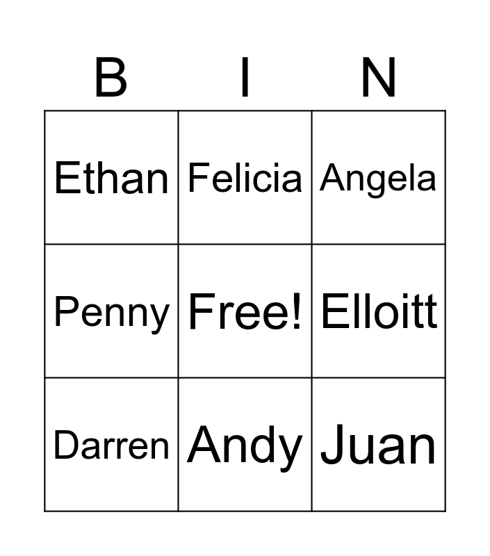 This bingo card has a free space and 8 words: Penny, Felicia, Elloitt, Darren, Angela, Ethan, Andy and Juan.