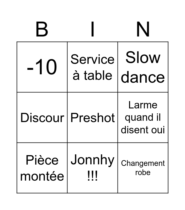This bingo card has a free space and 8 words: Larme quand il disent oui, Slow dance, Service à table, Pièce montée, -10, Changement robe, Discour and Jonnhy !!!.