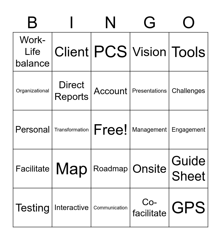This bingo card has a free space and 59 words: Roundtable, Interactive, conversation, Facilitate, Co-facilitate, Agenda, Direct Reports, Q&A, Presentations, Feedback, Vision, Leadership, Organizational, changes, Team meetings, Work-Life balance, GPS, Tools, Projections, Account, Management, PCS, Testing, Guide Sheet, Plan Setup Process, Business Owner, Predictability, Expertise, Challenges, Client Services, PBM Operations, Implementation, Service, Excellence, Client, Implementations, Value, Transformation, Overview, Personal, Journey, Map, Engagement, Results, Workstream, Update, Metrics, myPBM, Roadmap, Communication, Enhancements, Recognitions, Survey, Logistics, File, Onsite, Hosts, Requirements and Status.