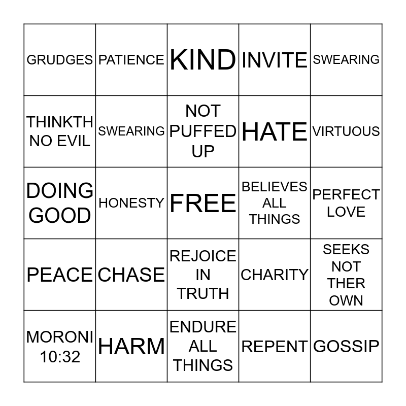 This bingo card has a free space and 24 words: CHASE, HARM, NOT PUFFED UP, MORONI 10:32, SWEARING, GRUDGES, THINKTH NO EVIL, PATIENCE, BELIEVES ALL THINGS, REJOICE IN TRUTH, HATE, DOING GOOD, CHARITY, SEEKS NOT THER OWN, SWEARING, REPENT, PERFECT LOVE, KIND, VIRTUOUS, HONESTY, GOSSIP, PEACE, INVITE and ENDURE ALL THINGS.