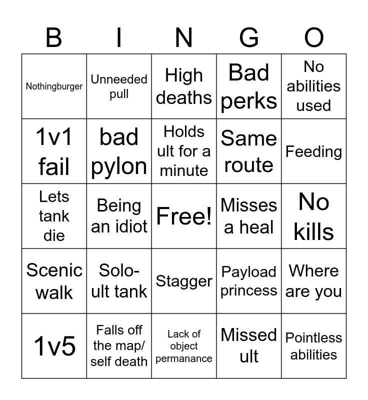 This bingo card has a free space and 24 words: Solo-ult tank, Falls off the map/ self death, Holds ult for a minute, 1v5, No abilities used, Nothingburger, 1v1 fail, Unneeded pull, Misses a heal, Stagger, Same route, Lets tank die, Payload princess, Where are you, bad pylon, Missed ult, No kills, High deaths, Feeding, Being an idiot, Pointless abilities, Scenic walk, Bad perks and Lack of object permanance.