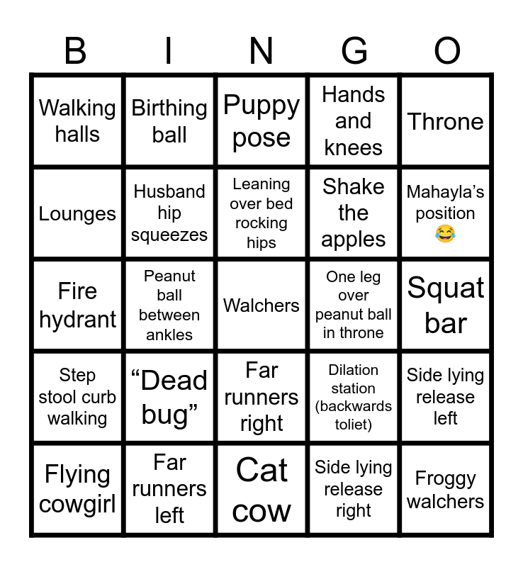 This bingo card has a free space and 24 words: “Dead bug”, Far runners left, Leaning over bed rocking hips, Flying cowgirl, Throne, Walking halls, Lounges, Birthing ball, One leg over peanut ball in throne, Far runners right, Shake the apples, Fire hydrant, Dilation station (backwards toliet), Side lying release left, Husband hip squeezes, Side lying release right, Squat bar, Puppy pose, Mahayla’s position 😂, Peanut ball between ankles, Froggy walchers, Step stool curb walking, Hands and knees and Cat cow.