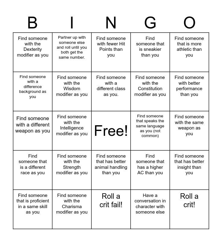 This bingo card has a free space and 24 words: Find someone with the Strength modifier as you, Find someone with the Charisma modifier as you, Find someone with a different class as you., Find someone that is proficient in a same skill as you, Find someone that is more athletic than you, Find someone with the Dexterity modifier as you, Find someone with a difference background as you, Partner up with someone else and roll until you both get the same number., Find someone that speaks the same language as you (not common), Find someone that has better animal handling than you, Find someone with the Constitution modifier as you, Find someone with a different weapon as you, Find someone that has a higher AC than you, Find someone that has better insight than you, Find someone with the Wisdom modifier as you, Have a conversation in character with someone else, Find someone with the same weapon as you, Find someone with fewer Hit Points than you, Find someone with better performance than you, Find someone with the Intelligence modifier as you, Roll a crit!, Find someone that is a different race as you, Find someone that is sneakier than you and Roll a crit fail!.
