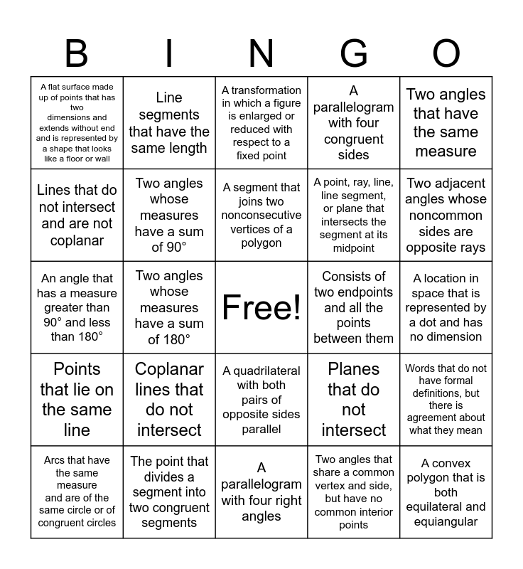 This bingo card has a free space and 34 words: An angle that has a measure greater than 0° and less than 90°, Two angles that share a common vertex and side, but have no common interior points, A set of points consisting of two different rays that have the same endpoint, When three points are collinear, one point is between the other two., Points that lie on the same line, Two angles whose measures have a sum of 90°, Two angles that have the same measure, Arcs that have the same measure and are of the same circle or of congruent circles, Line segments that have the same length, Points that lie in the same plane, A segment that joins two nonconsecutive vertices of a polygon, A transformation in which a figure is enlarged or reduced with respect to a fixed point, Points that represent the ends of a line segment or ray, A line has one dimension. It is represented by a line with two arrowheads, but it extends without end., Consists of two endpoints and all the points between them, Two adjacent angles whose noncommon sides are opposite rays, The point that divides a segment into two congruent segments, An angle that has a measure greater than 90° and less than 180°, Coplanar lines that do not intersect, Planes that do not intersect, A quadrilateral with both pairs of opposite sides parallel, Two lines that intersect to form a right angle, A flat surface made up of points that has two dimensions and extends without end and is represented by a shape that looks like a floor or wall, A location in space that is represented by a dot and has no dimension, A parallelogram with four right angles, A convex polygon that is both equilateral and equiangular, A parallelogram with four congruent sides, An angle that has a measure of 90°, A point, ray, line, line segment, or plane that intersects the segment at its midpoint, Lines that do not intersect and are not coplanar, An angle that has a measure of 180°, Two angles whose measures have a sum of 180°, Words that do not have formal definitions, but there is agreement about what they mean and Two angles whose sides form two pairs of opposite rays.