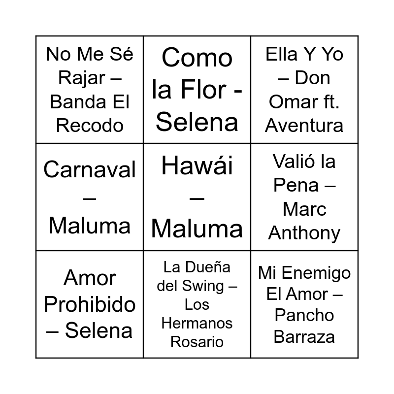 This bingo card has 20 words: El Chico del Apartamento 512 - Selena, Tusa – Karol G & Nicki Minaj, Ella Y Yo – Don Omar ft. Aventura, Bonita – Jowell & Randy, J Balvin, MAMIII – Becky G & Karol G, Hawái – Maluma, El Rey – Vicente Fernández, No Me Sé Rajar – Banda El Recodo, Mi Enemigo El Amor – Pancho Barraza, Como la Flor - Selena, On The Floor - Jennifer Lopez feat. Pitbull, Propuesta Indecente – Romeo Santos, Valió la Pena – Marc Anthony, Te Amo – Franco de Vita, Amor Prohibido – Selena, Llorar – Jesse & Joy ft. Mario Domm, La Dueña del Swing – Los Hermanos Rosario, Carnaval – Maluma, Mueve la Cintura – Grupo Mania and Mariposa Traicionera – Maná.