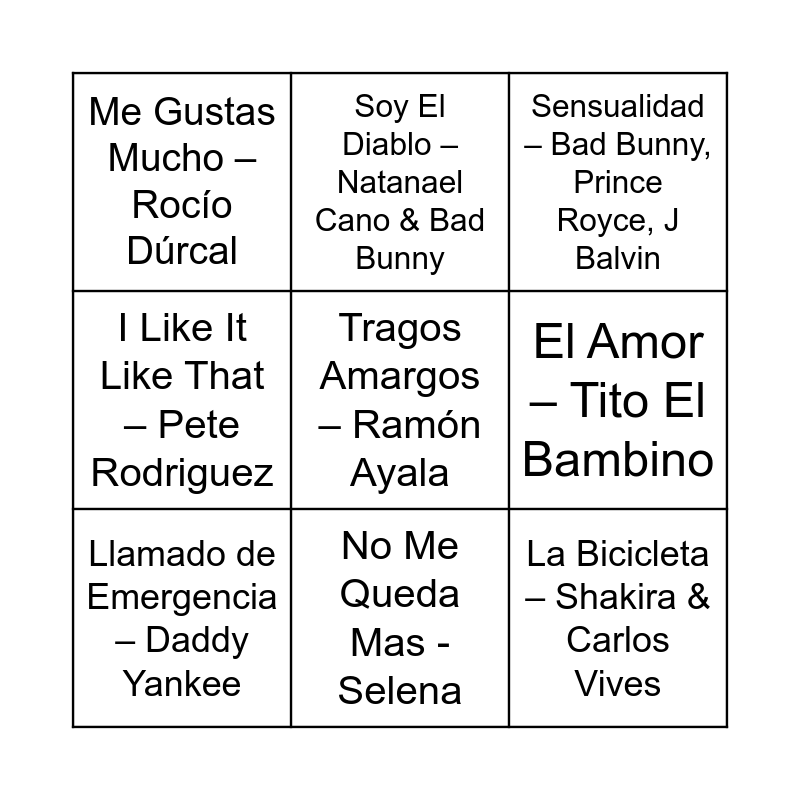 This bingo card has 19 words: Tabaco y Chanel – Bacilos, Mayores – Becky G ft. Bad Bunny, Sensualidad – Bad Bunny, Prince Royce, J Balvin, Se Acabó El Amor – Abraham Mateo, Bichota – Karol G, Tragos Amargos – Ramón Ayala, Botella Tras Botella – Gera MX & Christian Nodal, Me Gustas Mucho – Rocío Dúrcal, Soy El Diablo – Natanael Cano & Bad Bunny, La Bicicleta – Shakira & Carlos Vives, Duele el Corazón – Enrique Iglesias ft. Wisin, El Amor – Tito El Bambino, Llamado de Emergencia – Daddy Yankee, Oye Mi Amor – Maná, Stand by Me – Prince Royce, La Cumbia del Río – Grupo Cañaveral, I Like It Like That – Pete Rodriguez, No Me Queda Mas - Selena and Me Liberé – El Gran Combo.
