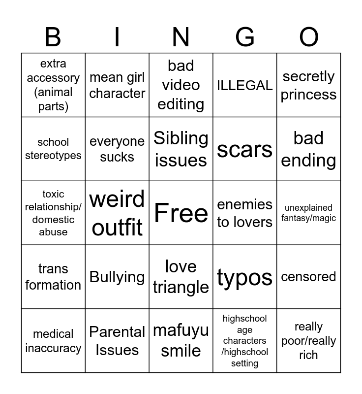 This bingo card has a free space and 24 words: Bullying, Parental Issues, Sibling issues, medical inaccuracy, secretly princess, extra accessory (animal parts), school stereotypes, mean girl character, enemies to lovers, love triangle, scars, toxic relationship/ domestic abuse, typos, censored, everyone sucks, highschool age characters /highschool setting, unexplained fantasy/magic, bad video editing, bad ending, weird outfit, really poor/really rich, trans formation, ILLEGAL and mafuyu smile.