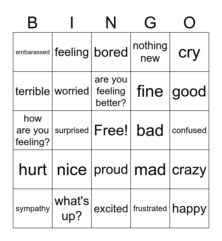 This bingo card has a free space and 31 words: excited, sad, surprised, love, embarassed, bored, worried, mad, bad, frustrated, confused, happy, scared, tired, good, mean, crazy, nice, hurt, proud, cry, nervous, sympathy, feeling, fine, terrible, nothing new, how are you feeling?, what's up?, are you feeling better? and where have you been?.
