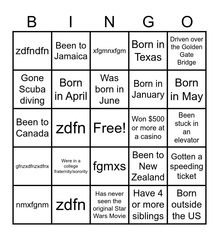 This bingo card has a free space and 111 words: sdfgsd, sdgsazdg, sdgsadzzadsf, sd, azsdfhzasdfh, azsdhgdsazfh, azdfshb, zsadfhb, dfhbnzs, dzsafhdzsa, zadfhbzdf, zdfhzd, zdfhzdf, zdfhzdf, xfgnxfgn, sxffgn, fgmxs, fgmnxfg, xfm, gnxfg, nmxfgnm, xfgmnxfgm, xfgm, xfgmxf, mxgfmxf, gfnzxdfnzxdfnx, zdfn, zfnzdf, nzd, fzfndn, zdfndfn, zdfn, zdfn, zdf, n, Is Left Handed, Plays a musical instrument, Has a pet that's not a cat or dog, Is an only child, Has lived abroad, Fluent in multiple languages, Wears Contact Lenses, Doesn't Drink Coffee, Is Vegetarian or Vegan, Was born in June, Has swam in more than one ocean, Has never seen the original Star Wars Movie, Ridden in an Ambulance, Native to the Houston area, Ran a Marathon, Eaten Alligator, Been to all 5 continents, Attended more than 1 Super Bowl, Won a Karaoke competition, Rode an Elephant, Is a twin/triplet, etc., Gone Scuba diving, Jumped out of an airplane, Visited Buc-ees not in Texas, Bowled a perfect game, Is the oldest child, Is the youngest child, Been on TV, Been in a movie, Played/Sang in a band, Born in January, Born in February, Born on Leap Day (Feb 29th), Born in March, Born in April, Born in May, Born in July, Born in August, Born in September, Born in October, Born in November, Born in December, Are a Military Veteran, Have more than one college degree, Were in a college fraternity/sorority, Lettered in high school, Have 4 or more siblings, Won $500 or more at a casino, Gotten a speeding ticket, Been deep sea fishing, Went to college on full scholarship, Born in Texas, Born in the US, not Texas, Born outside the US, Visited the top of the Empire State Building, Driven over the Golden Gate Bridge, Been to Disney Land/Disney World, Currently Owns vinyl records and a functional turntable, Read War & Peace by Tolstoy (all of it), Was married somewhere other than a church, Floated on the Guadalupe River, Been to Canada, Been to Alaska, Been to Hawai'i, Been to Maine, Been to China, Been to Japan, Been to Europe, Been to Australia, Been to New Zealand, Been to Jamaica, Visited Washington D.C., Slept in a Yurt, Fell Asleep in a public place, Been stuck in an elevator and Can/have changed car tire.