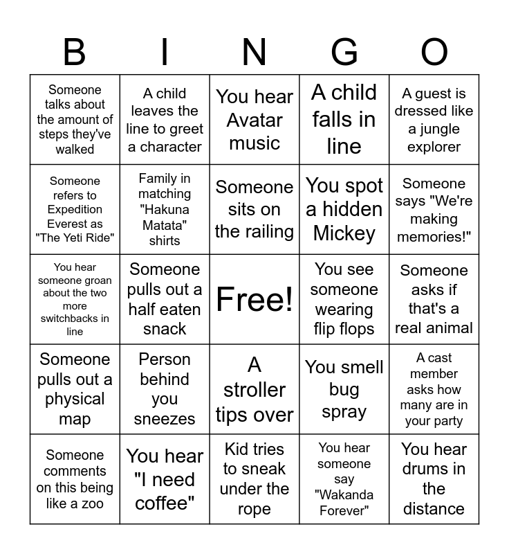 This bingo card has a free space and 29 words: Someone comments on this being like a zoo, Child makes animal noises, Someone pulls out a half eaten snack, Guest tries to film TikTok video in line, Someone talks about the amount of steps they've walked, You hear Avatar music, Family in matching "Hakuna Matata" shirts, Person behind you sneezes, You see someone wearing flip flops, You hear "I need coffee", Someone asks if that's a real animal, You hear drums in the distance, Kid tries to sneak under the rope, You hear someone say "Wakanda Forever", Someone says "We're making memories!", A child cries, A stroller tips over, Someone pulls out a physical map, A guest is dressed like a jungle explorer, You hear someone groan about the two more switchbacks in line, You smell bug spray, Someone removes their ears, You spot a hidden Mickey, Someone refers to Expedition Everest as "The Yeti Ride", A child falls in line, A child leaves the line to greet a character, A cast member asks how many are in your party, Someone sits on the railing and Someone sits on the railing and a cast member tells them not to.