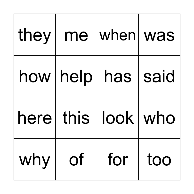 This bingo card has 20 words: who, what, when, where, why, how, of, they, here, me, this, look, help, too, has, play, said, was, for and have.