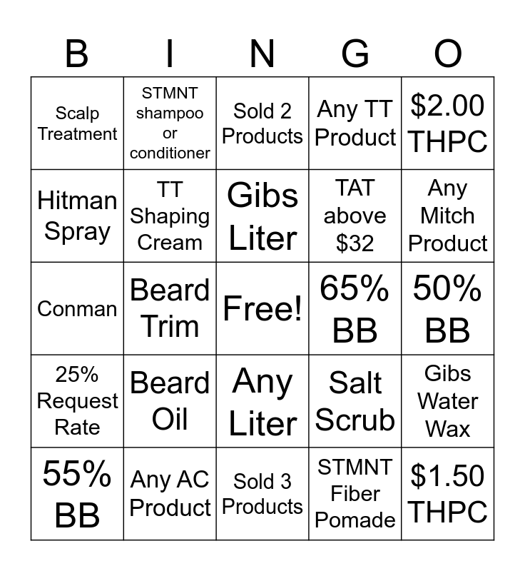 This bingo card has a free space and 29 words: 55% BB, TT Liter, Beard Trim, Double MVP, Scalp Treatment, Sold 2 Products, TT Shaping Cream, Beard Oil, 65% BB, Any AC Product, 50% BB, $1.50 THPC, Sold 3 Products, STMNT Fiber Pomade, Any Mitch Product, TAT above $30, Any Liter, 25% Request Rate, $2.00 THPC, Conman, Salt Scrub, Any STMNT Product, TAT above $32, Hitman Spray, Any TT Product, STMNT shampoo or conditioner, Gibs Water Wax, Gibs Liter and TAT above $28.
