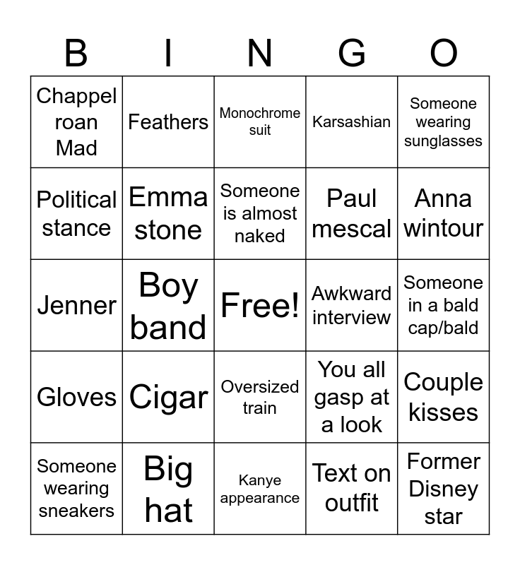 This bingo card has a free space and 24 words: Cigar, Big hat, Someone is almost naked, Someone wearing sneakers, Someone wearing sunglasses, Chappel roan Mad, Political stance, Feathers, Awkward interview, Oversized train, Paul mescal, Jenner, You all gasp at a look, Couple kisses, Emma stone, Text on outfit, Someone in a bald cap/bald, Monochrome suit, Anna wintour, Boy band, Former Disney star, Gloves, Karsashian and Kanye appearance.