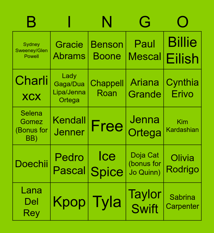This bingo card has a free space and 24 words: Pedro Pascal, Kpop, Chappell Roan, Lana Del Rey, Billie Eilish, Sydney Sweeney/Glen Powell, Charli xcx, Gracie Abrams, Jenna Ortega, Ice Spice, Ariana Grande, Selena Gomez (Bonus for BB), Doja Cat (bonus for Jo Quinn), Olivia Rodrigo, Lady Gaga/Dua Lipa/Jenna Ortega, Taylor Swift, Kim Kardashian, Benson Boone, Cynthia Erivo, Kendall Jenner, Sabrina Carpenter, Doechii, Paul Mescal and Tyla.