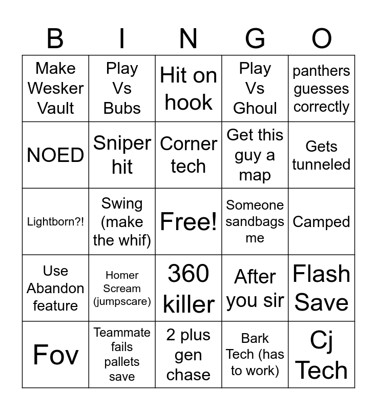 This bingo card has a free space and 24 words: Homer Scream (jumpscare), Teammate fails pallets save, Corner tech, Fov, panthers guesses correctly, Make Wesker Vault, NOED, Play Vs Bubs, Someone sandbags me, 360 killer, Get this guy a map, Lightborn?!, After you sir, Flash Save, Sniper hit, Bark Tech (has to work), Camped, Hit on hook, Gets tunneled, Swing (make the whif), Cj Tech, Use Abandon feature, Play Vs Ghoul and 2 plus gen chase.