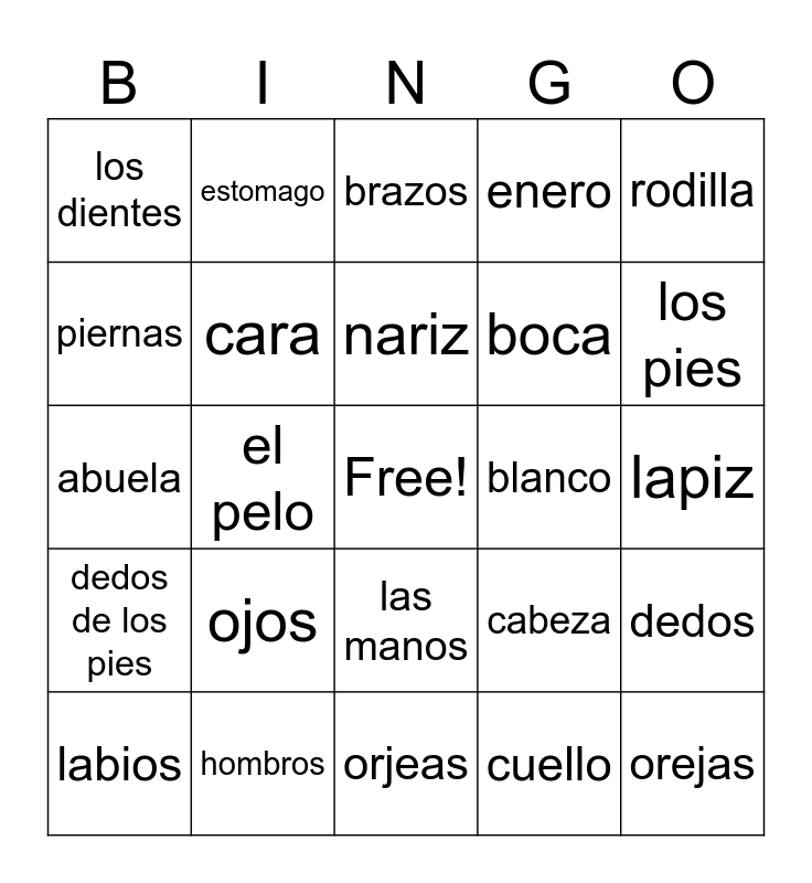 This bingo card has a free space and 24 words: ojos, hombros, nariz, labios, rodilla, los dientes, piernas, estomago, blanco, las manos, boca, abuela, cabeza, dedos, cara, cuello, lapiz, brazos, los pies, el pelo, orejas, dedos de los pies, enero and orjeas.