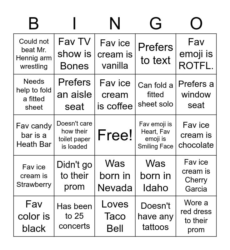 This bingo card has a free space and 86 words: Was born in Montana, Was born in Nebraska, Was born in Nevada, Was born in Ohio, Fav TV show is South Park, Fav TV show is The Pitt, Fav TV show is Roadkill, Fav TV show is K-Drama, Fav TV show is Iron Chef, Fav TV show is True South, Fav TV Show is Seinfeld, Fav ice cream is mocha almond fudge, Fav ice cream is Cherry Garcia, Fav ice cream is chocolate, Fav ice cream is orange sherbet, Fav ice cream is coffee, Loves all flavors of ice cream, Fav ice cream is vanilla bean, Fav ice cream is huckleberry, Fav candy bar is Snickers, Fav candy bar is Reece's, Fav candy is Hot Tamales, Fav candy bar is a Heath Bar, Has one tattoo, Doesn't have any tattoos, Has been to 20 concerts, Has been to 100 concerts, Has been to 10 concerts, Has been to 5 concerts, Has been to 42 concerts, Has been to 25 concerts, Wore a white lace hoop skirt dress to their prom, Wore a black, floor length gown to their prom, Didn't go to their prom, Needs help to fold a fitted sheet, Prefers talking over texting, Prefers a window seat, Thinks they can beat Mr. Hennig arm wrestling, Thinks they probably could beat Mr. Hennig arm wrestling, Doesn't care how their toilet paper is loaded, Likes their toilet paper to roll from the bottom, Fav emoji is Melting Face, Fav emoji is Face w/Tears of Joy, Fav emoji is Heart, Fav emoji is Smiling Face, Never uses emojis, Fav emoji is ROTFL., Fav color is blue, Fav TV show is Bones, Graduated HS in the 1980s, Has 2 children, Born in California, Has 1 grandchild, Fav ice cream is Strawberry, Fav candy bar is Twix, Has 7 tattoos, Has been to over 200 concerts, Wore a gray tux to their prom, Can fold a fitted sheet solo, Prefers to text, Prefers an aisle seat, Could not beat Mr. Hennig arm wrestling, Toilet paper rolls from the top, Favorite emoji is Thumbs up, Fav color is Red, Loves In N Out, Fav ice cream is vanilla, Fav TV show is Yellowstone, Wore a red dress to their prom, Has 3 tattoos, Has 4 children, Fav color is yellow, Fav color is purple, Fav color is black, Loves Panda Express, Loves Jimmy John's, Loves Raising Cane's, Loves Taco Bell, Fav fast food is pizza, Loves McD's breakfast burrito, Graduated HS in the 90s, Graduated HS in the 70s, Graduated HS in the 2000s, Has 1 child, Has 3 children, Has 2 grandchildren, Was born in Idaho and Was born in Washington.