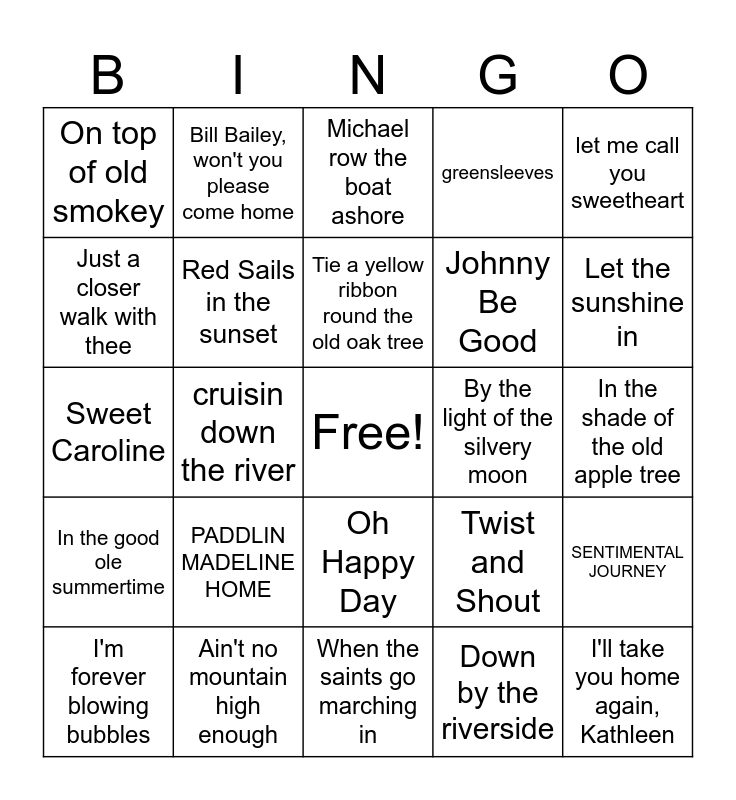 This bingo card has a free space and 37 words: I've got a lovely bunch of coconuts, Easter parade, Beer barrel polka, Red Sails in the sunset, SENTIMENTAL JOURNEY, PADDLIN MADELINE HOME, Tie a yellow ribbon round the old oak tree, the band played on, let me call you sweetheart, beautiful brown eyes, cruisin down the river, greensleeves, I'll take you home again, Kathleen, In the shade of the old apple tree, Just a closer walk with thee, In the good ole summertime, I'm looking over a 4 leaf clover, Michael row the boat ashore, Oh Happy Day, By the light of the silvery moon, On top of old smokey, Let the sunshine in, I'm forever blowing bubbles, When the saints go marching in, Whispering Hope, Down by the riverside, Bill Bailey, won't you please come home, If you were the only girl in the world, Ta-Ra-Ra-Boom Dre-e!, Zippedity Do Da, When you and I were young, Maggie, Ain't no mountain high enough, Sweet Caroline, Hey Jude, Twist and Shout, Johnny Be Good and Yellow Submarine.