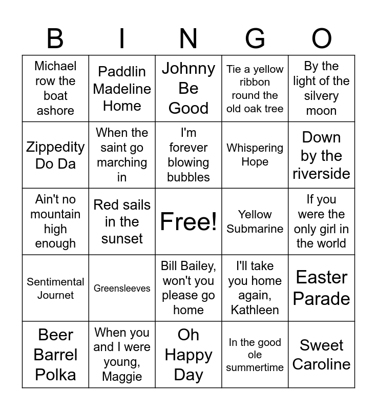 This bingo card has a free space and 37 words: Just a closer walk with thee, Cruisin down the river, Let the sunshine in, When the saint go marching in, Easter Parade, Greensleeves, I'm forever blowing bubbles, Hey Jude, By the light of the silvery moon, On top of old smokey, Red sails in the sunset, Tie a yellow ribbon round the old oak tree, Sweet Caroline, If you were the only girl in the world, Zippedity Do Da, Sentimental Journet, Twist and Shout, Johnny Be Good, Bill Bailey, won't you please go home, Yellow Submarine, Michael row the boat ashore, Down by the riverside, Beer Barrel Polka, Oh Happy Day, The band played on, In the good ole summertime, Paddlin Madeline Home, I'm looking over a 4 leaf clover, Let me call you sweetheart, Beautiful Brown Eyes, Ta-Ra-Ra-Boom Dre-e!, When you and I were young, Maggie, Ain't no mountain high enough, I've got a lovely bunch of coconuts, I'll take you home again, Kathleen, Whispering Hope and In the shade of the old apple tree.