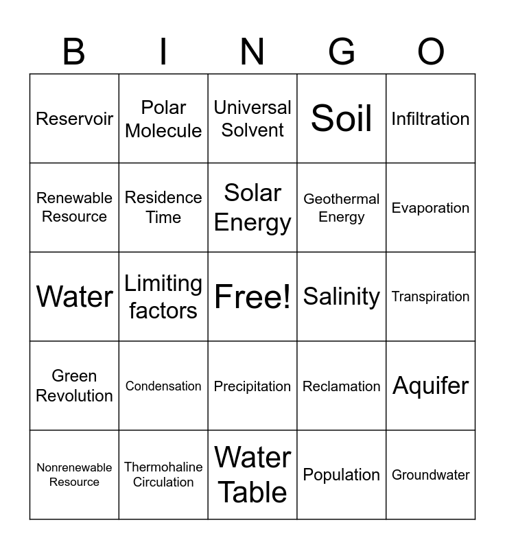 This bingo card has a free space and 24 words: Condensation, Thermohaline Circulation, Solar Energy, Nonrenewable Resource, Infiltration, Reservoir, Renewable Resource, Polar Molecule, Salinity, Precipitation, Geothermal Energy, Water, Reclamation, Aquifer, Residence Time, Population, Transpiration, Universal Solvent, Evaporation, Limiting factors, Groundwater, Green Revolution, Soil and Water Table.
