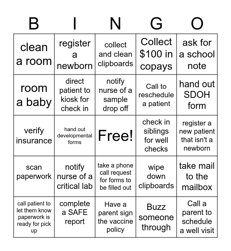 This bingo card has a free space and 32 words: Buzz someone through, Parent hangs up on you, hand out developmental forms, notify a nurse of a nurse visit arrival, scan paperwork, direct patient to kiosk for check in, ask for a school note, take mail to the mailbox, register a newborn, handout a new patient packet, notify nurse of a sample drop off, collect and clean clipboards, schedule a return visit, send a phone call to the triage line, check in siblings for well checks, print faxes, call patient to let them know paperwork is ready for pick up, verify insurance, take a phone call request for forms to be filled out, notify nurse of a critical lab, wipe down clipboards, give teens sti screening letter, register a new patient that isn't a newborn, complete a SAFE report, Call a parent to schedule a well visit, Collect $100 in copays, Call to reschedule a patient, room a baby, clean a room, Have a parent sign the vaccine policy, give directions to the bathroom and hand out SDOH form.