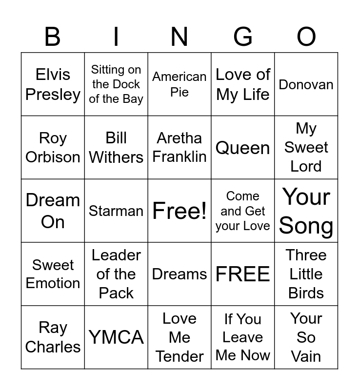 This bingo card has a free space and 25 words: Leader of the Pack, Love Me Tender, Aretha Franklin, Ray Charles, Donovan, Elvis Presley, Roy Orbison, Sitting on the Dock of the Bay, Come and Get your Love, Dreams, Queen, Dream On, FREE, Three Little Birds, Bill Withers, Led Zepplin, Your Song, American Pie, My Sweet Lord, Starman, Your So Vain, YMCA, Sweet Emotion, Love of My Life and If You Leave Me Now.
