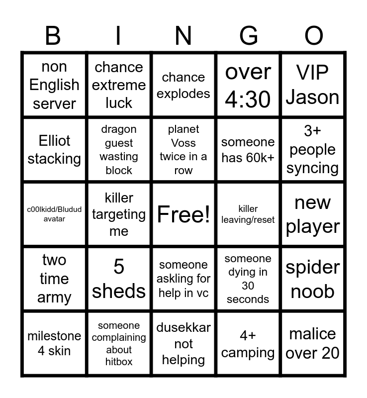 This bingo card has a free space and 24 words: 5 sheds, someone complaining about hitbox, planet Voss twice in a row, milestone 4 skin, VIP Jason, non English server, Elliot stacking, chance extreme luck, killer leaving/reset, someone askling for help in vc, someone has 60k+, c00lkidd/Bludud avatar, someone dying in 30 seconds, spider noob, dragon guest wasting block, 4+ camping, new player, chance explodes, 3+ people syncing, killer targeting me, malice over 20, two time army, over 4:30 and dusekkar not helping.