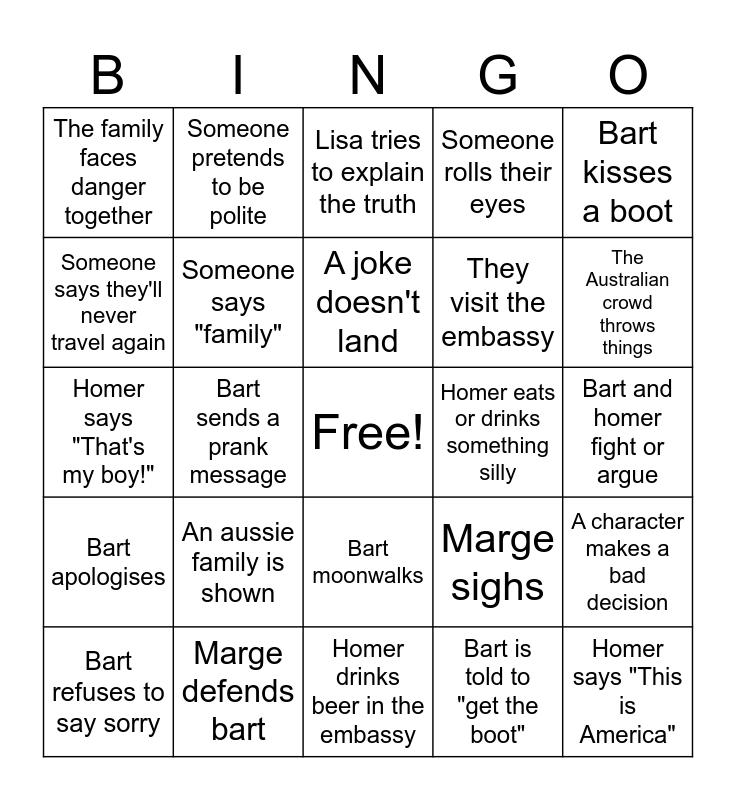 This bingo card has a free space and 29 words: Bart refuses to say sorry, Marge tries to keep the peace, Bart sends a prank message, A family member gets mad, The family faces danger together, Lisa tries to explain the truth, Someone says "family", An aussie family is shown, Homer eats or drinks something silly, Marge defends bart, Bart and homer fight or argue, Homer says "This is America", Homer drinks beer in the embassy, Bart is told to "get the boot", The Australian crowd throws things, Homer calls Australia "weird", Bart moonwalks, Bart apologises, Bart kisses a boot, Homer says "That's my boy!", Marge sighs, Lisa talks about the ecological damage from the frog, They visit the embassy, Someone says they'll never travel again, Someone rolls their eyes, Someone pretends to be polite, A character makes a bad decision, A joke doesn't land and Someone feels out of place.