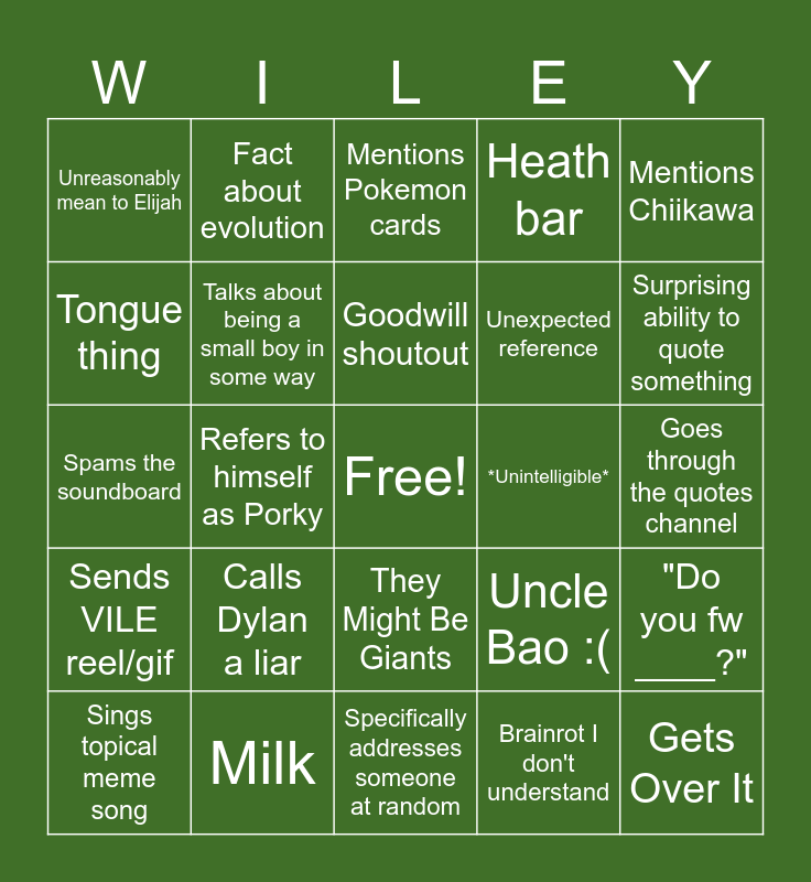 This bingo card has a free space and 26 words: They Might Be Giants, Brainrot I don't understand, Goodwill shoutout, Milk, Mentions Chiikawa, Unreasonably mean to Elijah, Tongue thing, Fact about evolution, Goes through the quotes channel, Uncle Bao :(, Unexpected reference, Spams the soundboard, "Do you fw ____?", Sings topical meme song, Refers to himself as Porky, Mentions bunless "h-dogs", Heath bar, Sends VILE reel/gif, Mentions Pokemon cards, Gets Over It, Surprising ability to quote something, Specifically addresses someone at random, *Unintelligible*, Calls Dylan a liar, Talks about being a small boy in some way and Inexplicable noise.