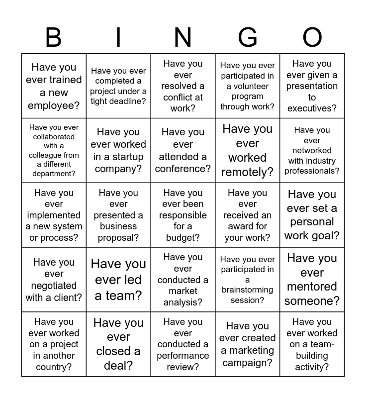 This bingo card has a free space and 24 words: Have you ever led a team?, Have you ever closed a deal?, Have you ever attended a conference?, Have you ever worked on a project in another country?, Have you ever given a presentation to executives?, Have you ever trained a new employee?, Have you ever collaborated with a colleague from a different department?, Have you ever completed a project under a tight deadline?, Have you ever received an award for your work?, Have you ever conducted a market analysis?, Have you ever worked remotely?, Have you ever implemented a new system or process?, Have you ever participated in a brainstorming session?, Have you ever mentored someone?, Have you ever worked in a startup company?, Have you ever created a marketing campaign?, Have you ever set a personal work goal?, Have you ever resolved a conflict at work?, Have you ever networked with industry professionals?, Have you ever presented a business proposal?, Have you ever worked on a team-building activity?, Have you ever negotiated with a client?, Have you ever participated in a volunteer program through work? and Have you ever conducted a performance review?.
