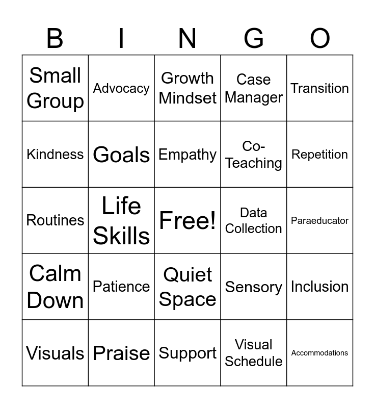 This bingo card has a free space and 50 words: IEP, Accommodations, Modifications, Support, Patience, Collaboration, Advocacy, Resourceful, Kindness, Progress, Goals, Case Manager, Inclusion, Sensory, Differentiation, Behavior Plan, Empathy, Data Collection, ABA, Transition, Life Skills, Visual Schedule, Small Group, Co-Teaching, Calm, Break Time, Repetition, Assistive Tech, Growth Mindset, Quiet Space, Communication, Functional, Flexible, Cueing, Praise, Safe Space, Daily Routine, Reinforcement, Zones of Regulation, Paraeducator, SLP (Speech-Language Pathologist), OT (Occupational Therapist), PT (Physical Therapist), Task Box, Visuals, Routines, Fidget, Timers, Calm Down and Superpower.