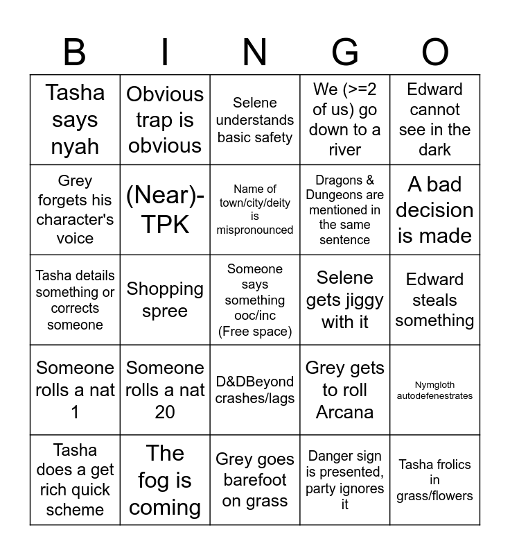 This bingo card has a free space and 24 words: Someone rolls a nat 20, The fog is coming, Name of town/city/deity is mispronounced, Tasha does a get rich quick scheme, Edward cannot see in the dark, Tasha says nyah, Grey forgets his character's voice, Obvious trap is obvious, Selene gets jiggy with it, D&DBeyond crashes/lags, Dragons & Dungeons are mentioned in the same sentence, Tasha details something or corrects someone, Grey gets to roll Arcana, Nymgloth autodefenestrates, (Near)-TPK, Danger sign is presented, party ignores it, Edward steals something, Selene understands basic safety, A bad decision is made, Shopping spree, Tasha frolics in grass/flowers, Someone rolls a nat 1, We (>=2 of us) go down to a river and Grey goes barefoot on grass.
