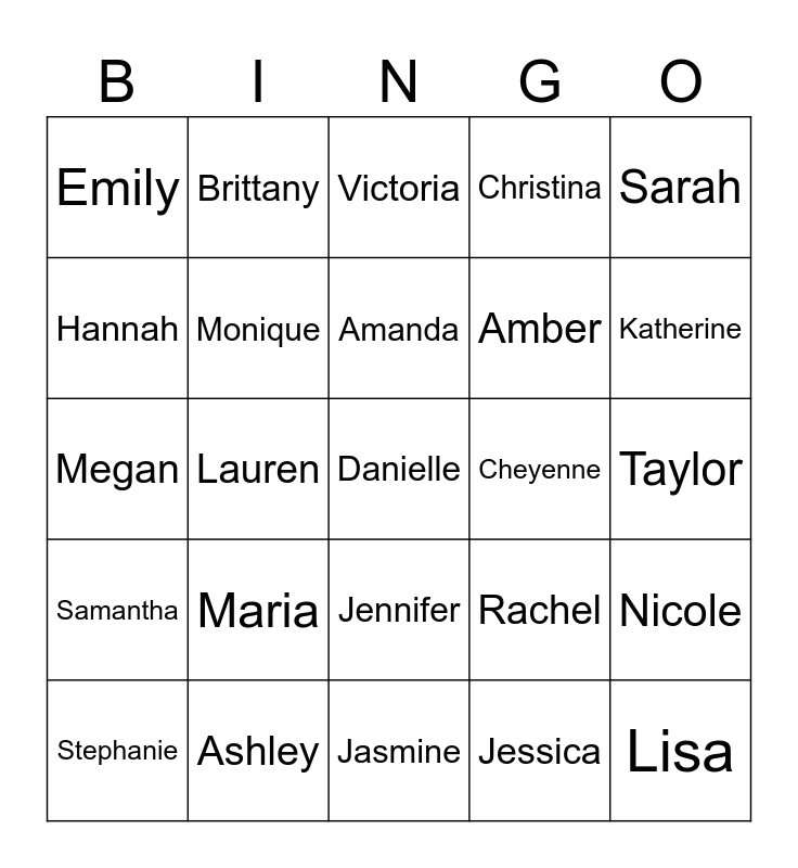 This bingo card has 26 words: Jennifer, Jessica, Amanda, Ashley, Sarah, Emily, Hannah, Brittany, Taylor, Rachel, Amber, Megan, Nicole, Stephanie, Lauren, Tiffany, Christina, Samantha, Victoria, Danielle, Katherine, Jasmine, Cheyenne, Maria, Monique and Lisa.