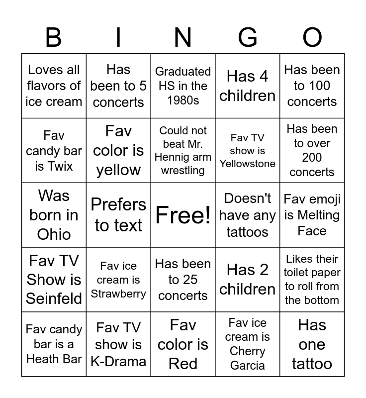 This bingo card has a free space and 87 words: Has 1 grandchild, Has been to 42 concerts, Has been to 25 concerts, Wore a white lace hoop skirt dress to their prom, Wore a black, floor length gown to their prom, Didn't go to their prom, Needs help to fold a fitted sheet, Prefers talking over texting, Prefers a window seat, Thinks they can beat Mr. Hennig arm wrestling, Thinks they probably could beat Mr. Hennig arm wrestling, Doesn't care how their toilet paper is loaded, Likes their toilet paper to roll from the bottom, Fav emoji is Melting Face, Prefers an aisle seat, Could not beat Mr. Hennig arm wrestling, Graduated HS in the 70s, Graduated HS in the 2000s, Has 1 child, Has 3 children, Was born in Montana, Was born in Nebraska, Was born in Nevada, Was born in Ohio, Fav TV show is South Park, Fav ice cream is Cherry Garcia, Fav ice cream is chocolate, Fav ice cream is orange sherbet, Fav ice cream is coffee, Fav TV show is The Pitt, Fav TV show is Roadkill, Fav TV show is K-Drama, Fav TV show is Iron Chef, Fav TV show is True South, Fav ice cream is Strawberry, Fav candy bar is Twix, Has 7 tattoos, Has been to over 200 concerts, Wore a gray tux to their prom, Can fold a fitted sheet solo, Prefers to text, Has 2 grandchildren, Was born in Idaho, Was born in Washington, Doesn't have any tattoos, Has been to 20 concerts, Has been to 100 concerts, Has been to 10 concerts, Has been to 5 concerts, Fav emoji is Face w/Tears of Joy, Fav emoji is Heart, Fav emoji is Smiling Face, Never uses emojis, Fav TV Show is Seinfeld, Fav ice cream is mocha almond fudge, Loves In N Out, Fav ice cream is vanilla, Fav TV show is Yellowstone, Wore a red dress to their prom, Has 3 tattoos, Has 4 children, Fav color is yellow, Fav color is purple, Fav color is black, Fav ice cream is huckleberry, Fav candy bar is Snickers, Fav candy bar is Reece's, Fav candy is Hot Tamales, Fav candy bar is a Heath Bar, Has one tattoo, Fav emoji is ROTFL., Fav color is blue, Fav TV show is Bones, Graduated HS in the 1980s, Has 2 children, Born in California, Toilet paper rolls from the top, Favorite emoji is Thumbs up, Fav color is Red, Loves Panda Express, Loves Jimmy John's, Loves Raising Cane's, Loves Taco Bell, Fav fast food is pizza, Loves McD's breakfast burrito, Graduated HS in the 90s, Loves all flavors of ice cream and Fav ice cream is vanilla bean.