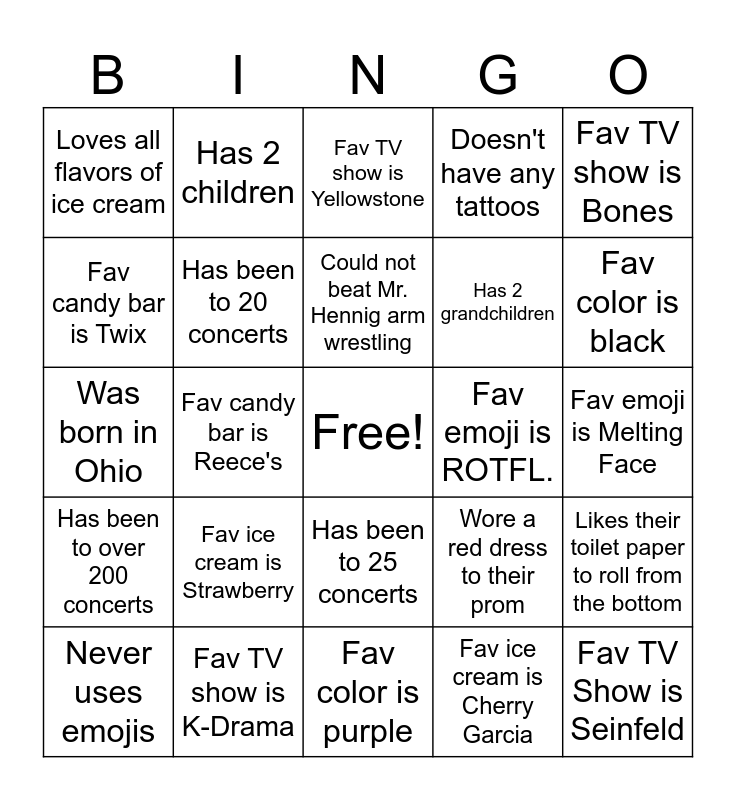 This bingo card has a free space and 87 words: Has 1 grandchild, Has been to 42 concerts, Has been to 25 concerts, Wore a white lace hoop skirt dress to their prom, Wore a black, floor length gown to their prom, Didn't go to their prom, Needs help to fold a fitted sheet, Prefers talking over texting, Prefers a window seat, Thinks they can beat Mr. Hennig arm wrestling, Thinks they probably could beat Mr. Hennig arm wrestling, Doesn't care how their toilet paper is loaded, Likes their toilet paper to roll from the bottom, Fav emoji is Melting Face, Prefers an aisle seat, Could not beat Mr. Hennig arm wrestling, Graduated HS in the 70s, Graduated HS in the 2000s, Has 1 child, Has 3 children, Was born in Montana, Was born in Nebraska, Was born in Nevada, Was born in Ohio, Fav TV show is South Park, Fav ice cream is Cherry Garcia, Fav ice cream is chocolate, Fav ice cream is orange sherbet, Fav ice cream is coffee, Fav TV show is The Pitt, Fav TV show is Roadkill, Fav TV show is K-Drama, Fav TV show is Iron Chef, Fav TV show is True South, Fav ice cream is Strawberry, Fav candy bar is Twix, Has 7 tattoos, Fav color is black, Fav ice cream is huckleberry, Fav candy bar is Snickers, Fav candy bar is Reece's, Fav candy is Hot Tamales, Fav candy bar is a Heath Bar, Has one tattoo, Fav emoji is ROTFL., Fav color is blue, Fav TV show is Bones, Graduated HS in the 1980s, Has 2 children, Born in California, Toilet paper rolls from the top, Favorite emoji is Thumbs up, Fav color is Red, Has been to over 200 concerts, Wore a gray tux to their prom, Can fold a fitted sheet solo, Prefers to text, Has 2 grandchildren, Was born in Idaho, Was born in Washington, Doesn't have any tattoos, Has been to 20 concerts, Has been to 100 concerts, Has been to 10 concerts, Has been to 5 concerts, Fav emoji is Face w/Tears of Joy, Fav emoji is Heart, Fav emoji is Smiling Face, Never uses emojis, Fav TV Show is Seinfeld, Fav ice cream is mocha almond fudge, Loves In N Out, Fav ice cream is vanilla, Fav TV show is Yellowstone, Wore a red dress to their prom, Has 3 tattoos, Has 4 children, Fav color is yellow, Fav color is purple, Loves Panda Express, Loves Jimmy John's, Loves Raising Cane's, Loves Taco Bell, Fav fast food is pizza, Loves McD's breakfast burrito, Graduated HS in the 90s, Loves all flavors of ice cream and Fav ice cream is vanilla bean.