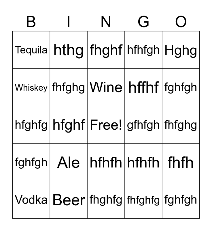 This bingo card has a free space and 24 words: Ale, Beer, Wine, Vodka, Hghg, Tequila, Whiskey, hthg, gfhfgh, hfhfh, hffhf, hfghfg, hfhfh, fhfh, fhfghg, fhfghfg, fhfghg, fhghf, fghfgh, hfghf, fghfgh, fghfgh, hfhfgh and fhghfg.