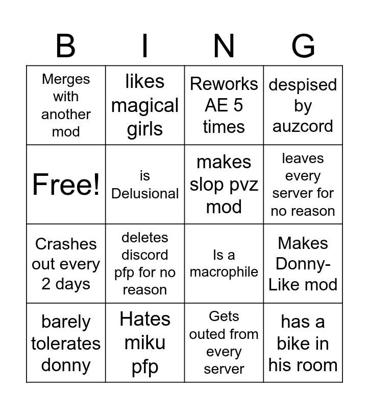 This bingo card has 16 words: Hates miku pfp, Makes Donny-Like mod, Reworks AE 5 times, Merges with another mod, Crashes out every 2 days, likes magical girls, Is a macrophile, Gets outed from every server, Free!, is Delusional, barely tolerates donny, despised by auzcord, deletes discord pfp for no reason, leaves every server for no reason, makes slop pvz mod and has a bike in his room.