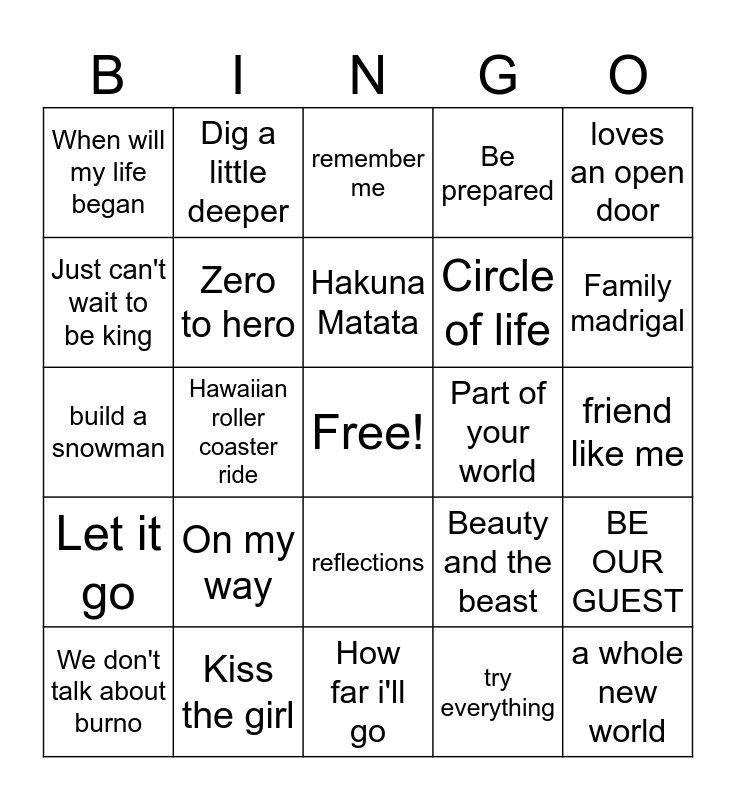 This bingo card has a free space and 29 words: We don't talk about burno, Make a man out of you, Hawaiian roller coaster ride, Almost there, When will my life began, remember me, Zero to hero, On my way, Part of your world, Kiss the girl, friend like me, a whole new world, How far i'll go, try everything, Family madrigal, You're welcome, reflections, Let it go, loves an open door, build a snowman, Beauty and the beast, Under the sea, Circle of life, Just can't wait to be king, Be prepared, Dig a little deeper, BE OUR GUEST, Hakuna Matata and Nobody like you.