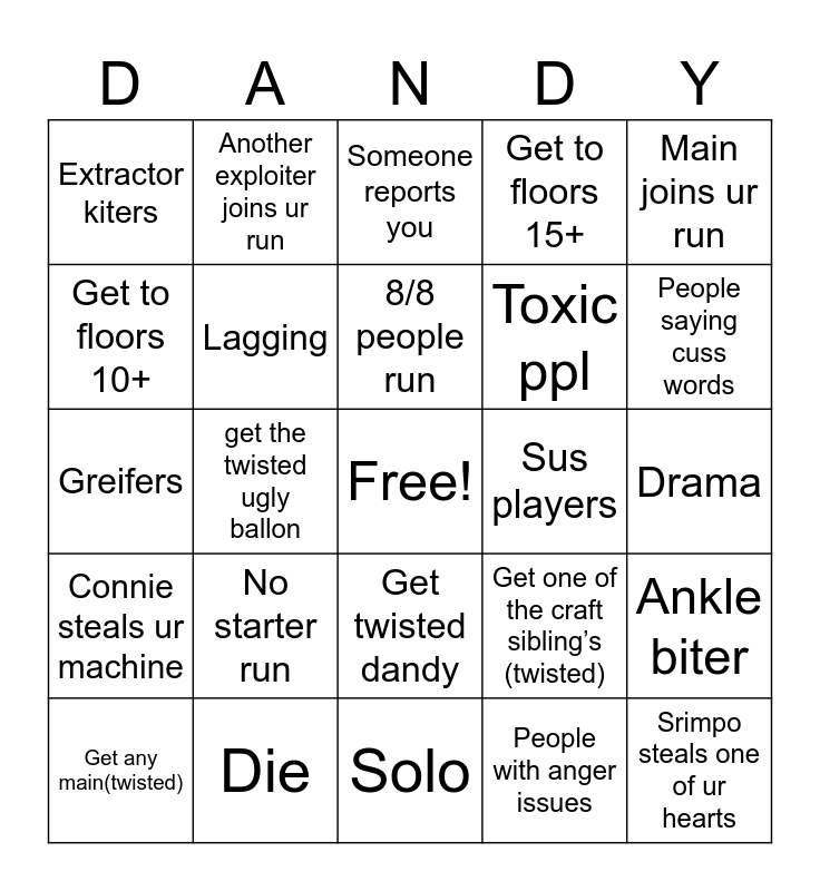 This bingo card has a free space and 24 words: No starter run, Die, 8/8 people run, Get any main(twisted), Main joins ur run, Extractor kiters, Get to floors 10+, Another exploiter joins ur run, Sus players, Get twisted dandy, Toxic ppl, Greifers, Get one of the craft sibling’s (twisted), Ankle biter, Lagging, People with anger issues, Drama, Someone reports you, People saying cuss words, get the twisted ugly ballon, Srimpo steals one of ur hearts, Connie steals ur machine, Get to floors 15+ and Solo.