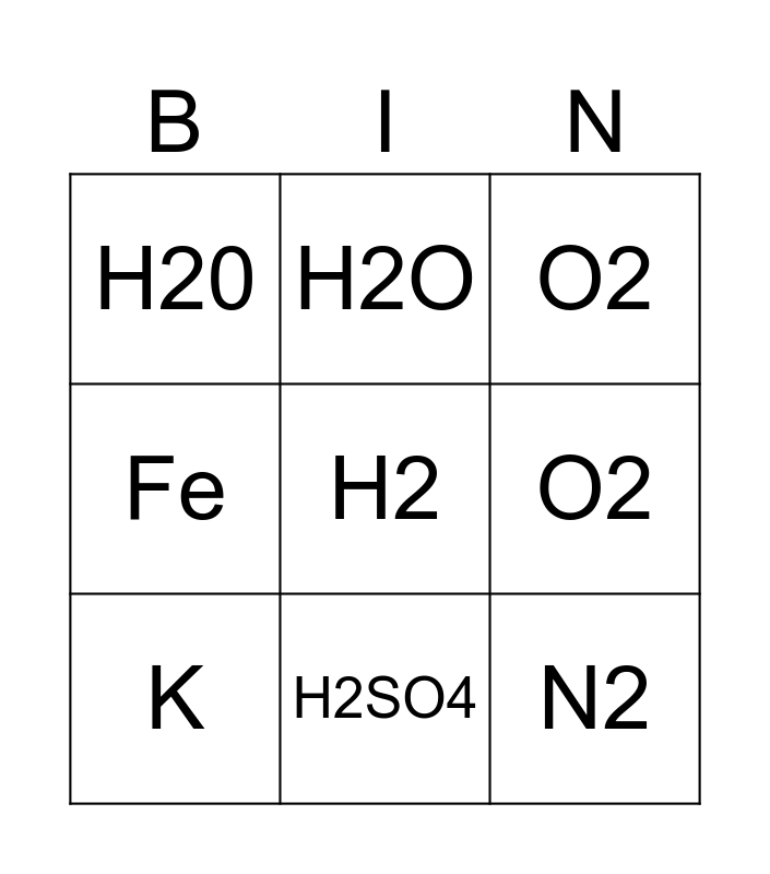 This bingo card has a free space and 15 words: NaCl, NaOH, O2, H20, H2SO4, N2, HCl, CO2, O2, Ne, H, Fe, K, H2O and MgO.