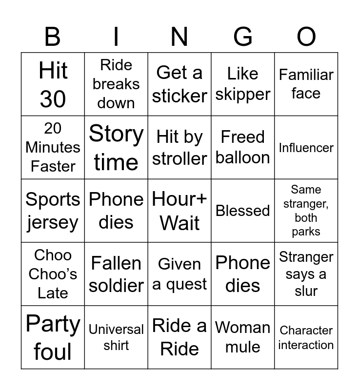 This bingo card has 25 words: Choo Choo’s Late, Universal shirt, Hour+ Wait, Woman mule, Familiar face, Hit 30, Ride breaks down, Get a sticker, Blessed, Stranger says a slur, 20 Minutes Faster, Story time, Ride a Ride, Phone dies, Influencer, Party foul, Phone dies, Hit by stroller, Freed balloon, Same stranger, both parks, Sports jersey, Fallen soldier, Given a quest, Like skipper and Character interaction.