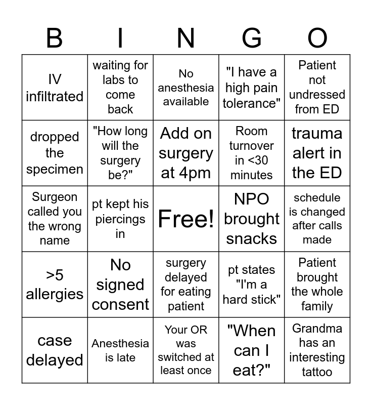 This bingo card has a free space and 24 words: No signed consent, Anesthesia is late, Add on surgery at 4pm, case delayed, Patient not undressed from ED, IV infiltrated, dropped the specimen, waiting for labs to come back, NPO brought snacks, surgery delayed for eating patient, Room turnover in <30 minutes, Surgeon called you the wrong name, pt states "I'm a hard stick", Patient brought the whole family, "How long will the surgery be?", "When can I eat?", schedule is changed after calls made, No anesthesia available, trauma alert in the ED, pt kept his piercings in, Grandma has an interesting tattoo, >5 allergies, "I have a high pain tolerance" and Your OR was switched at least once.
