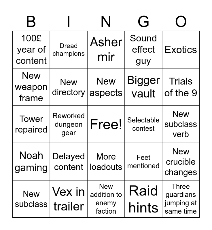 This bingo card has a free space and 24 words: Delayed content, Vex in trailer, New aspects, New subclass, Exotics, 100£ year of content, New weapon frame, Dread champions, Selectable contest, More loadouts, Bigger vault, Tower repaired, Feet mentioned, New crucible changes, New directory, Raid hints, New subclass verb, Asher mir, Trials of the 9, Reworked dungeon gear, Three guardians jumping at same time, Noah gaming, Sound effect guy and New addition to enemy faction.