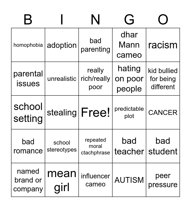 This bingo card has a free space and 24 words: school stereotypes, mean girl, really rich/really poor, named brand or company, racism, homophobia, parental issues, adoption, predictable plot, repeated moral ctachphrase, hating on poor people, school setting, bad teacher, bad student, unrealistic, AUTISM, CANCER, bad parenting, kid bullied for being different, stealing, peer pressure, bad romance, dhar Mann cameo and influencer cameo.