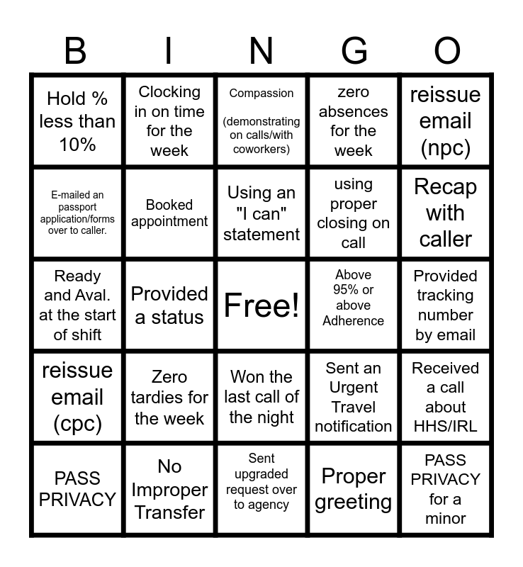 This bingo card has a free space and 24 words: PASS PRIVACY, Zero tardies for the week, Using an "I can" statement, Proper greeting, reissue email (npc), Hold % less than 10%, Clocking in on time for the week, Compassion (demonstrating on calls/with coworkers), Above 95% or above Adherence, Provided tracking number by email, Ready and Aval. at the start of shift, Booked appointment, Sent an Urgent Travel notification, Received a call about HHS/IRL, E-mailed an passport application/forms over to caller., No Improper Transfer, Sent upgraded request over to agency, zero absences for the week, Recap with caller, reissue email (cpc), Provided a status, Won the last call of the night, using proper closing on call and PASS PRIVACY for a minor.