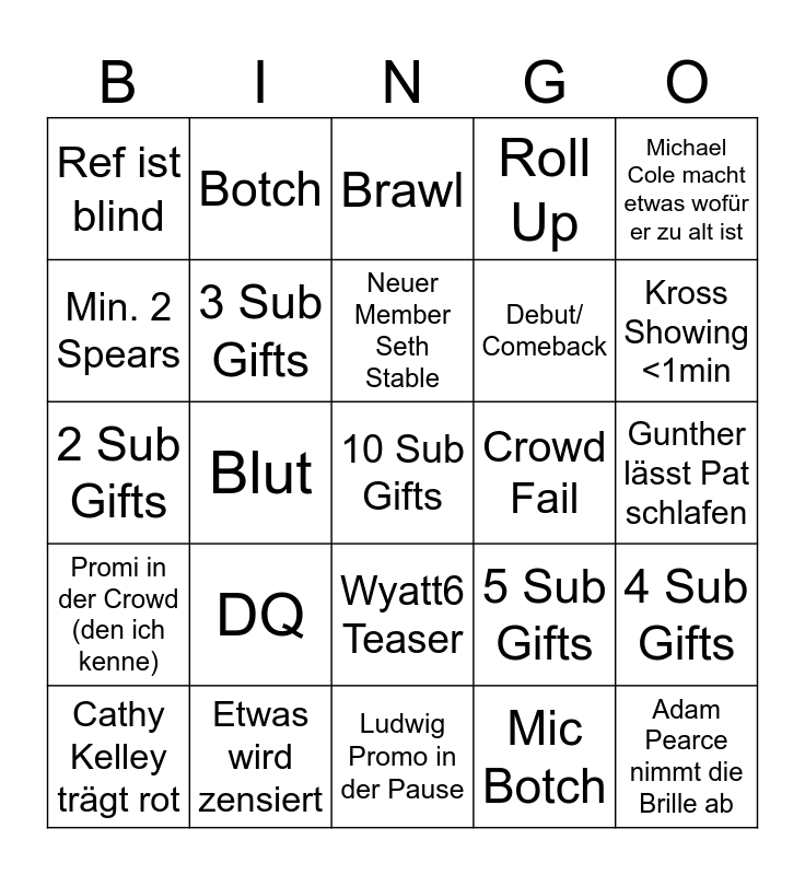 This bingo card has a free space and 24 words: Cathy Kelley trägt rot, DQ, Neuer Member Seth Stable, Mic Botch, Michael Cole macht etwas wofür er zu alt ist, Ref ist blind, Botch, Brawl, Crowd Fail, Gunther lässt Pat schlafen, 2 Sub Gifts, 3 Sub Gifts, 5 Sub Gifts, 4 Sub Gifts, Min. 2 Spears, Etwas wird zensiert, Ludwig Promo in der Pause, Roll Up, Kross Showing <1min, Promi in der Crowd (den ich kenne), Blut, Wyatt6 Teaser, Debut/ Comeback and Adam Pearce nimmt die Brille ab.