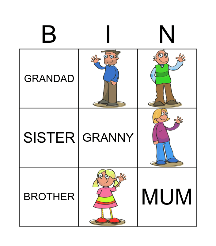 This bingo card has 6 images, a free space and 6 words: MUM, DAD, GRANDAD, SISTER, BROTHER and ME.