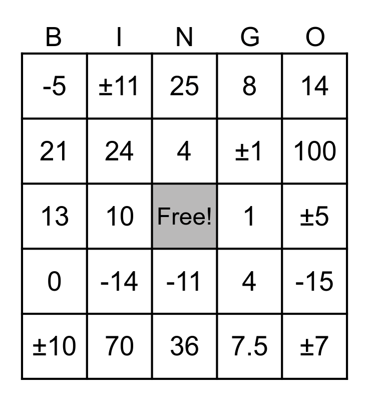 This bingo card has a free space and 30 words: 70, 81, 10, -20, -5, 25, 24, -11, 1, 36, ±5, ±7, 7.5, 7, 100, 20, 4, 0, -14, 14, 13, 6.5, ±11, ±1, 21, 8, -15, ±10, 4 and 5.