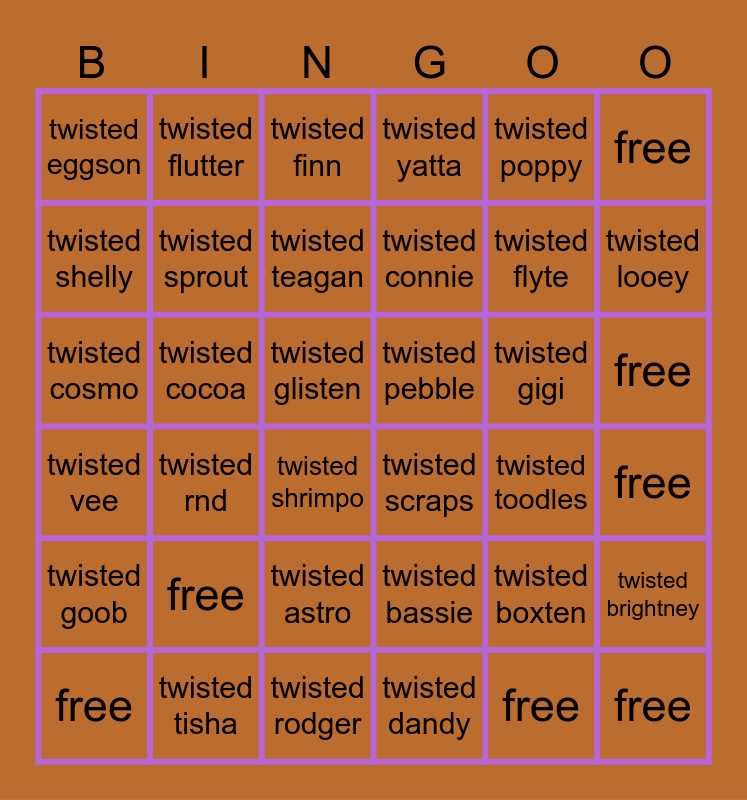 This bingo card has 36 words: twisted bassie, twisted astro, twisted dandy, twisted shelly, twisted vee, twisted pebble, twisted sprout, twisted rodger, twisted poppy, twisted boxten, twisted looey, twisted yatta, twisted brightney, twisted cocoa, twisted connie, twisted eggson, twisted goob, twisted gigi, twisted cosmo, twisted finn, twisted glisten, twisted rnd, twisted scraps, twisted shrimpo, twisted toodles, twisted flutter, twisted flyte, twisted tisha, twisted teagan, free, free, free, free, free, free and free.